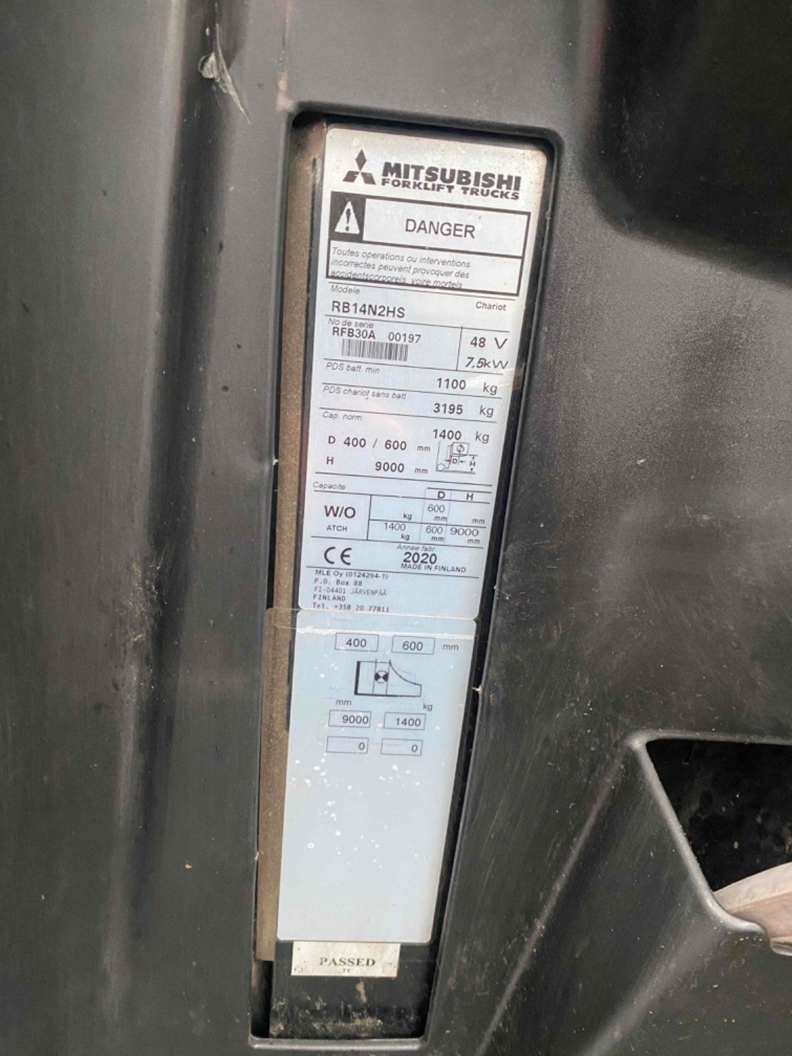 | Détails | HXF16ITF MAST,TRIPLEX REACH 1.4-1.6T H2 HXF16ITF 00967Mast S/N : VUL/DW VULKOLLAN DRIVE WHEELS BW48D775C CLASSIC BATTERY 775 AH CH48/100E EXIDE CHARGER 48V 100A BQFS48E WATER FILL PLUGS 48V, CLASSIC QBL RH QUICK BATT (UN)LOCKING SEAT SD SEAT/C SEAT CLOTH SUSPENSION BC775 BATTERY CARRIAGE 775 AH + RC ARM/C ARMREST FOR SEAT CLOTH 1 BAR ACCESSORY RACK STRB AMBER STROBE LIGHT RVM REAR VIEW MIRROR KEY SWITCH KEY SWITCH MFR FRENCH MARKINGS ITF900 TRIPLEX MAST, FL 9000 mm L1200 PAIR OF FORKS 1200 mm |