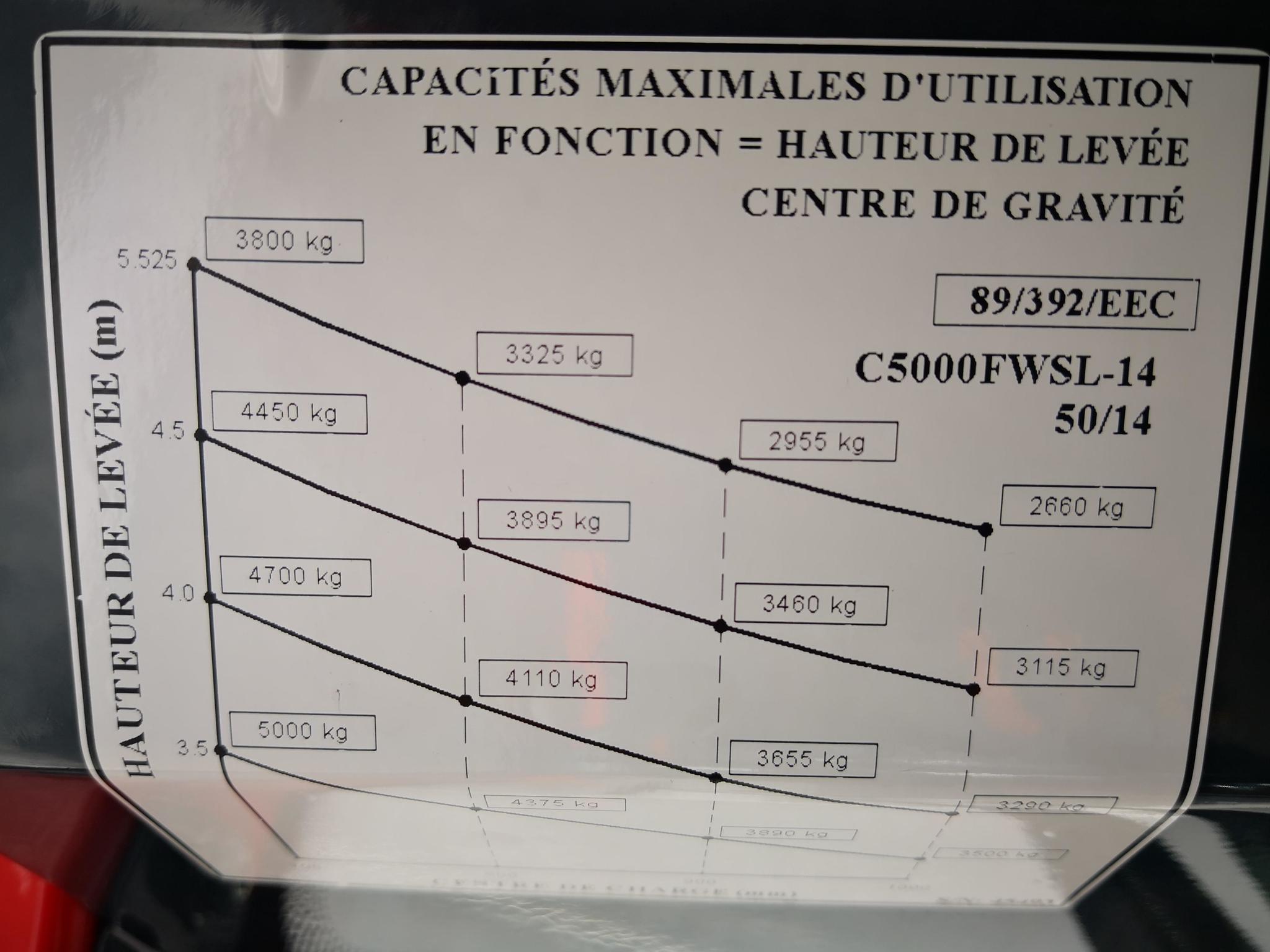 Capacité nominale 5000kg à 700mm de gravité à 3250mm d'élévation.