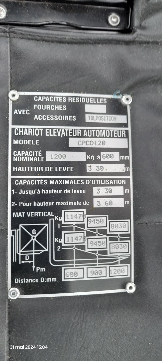 | Équipements | TDL (déplacement latéral), Positionneur de fourches, 4e valve arrivée au tablier, Cabine, Éclairage route |